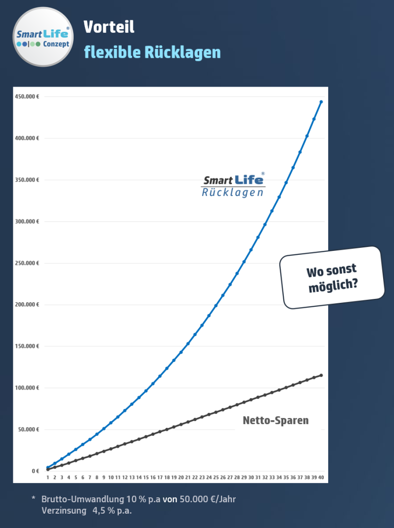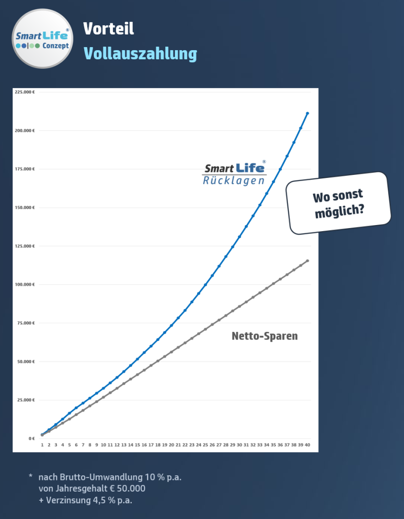Im Gegensatz zum Girokonto oder Sparbuch bzw. Fondssparen werden mit smartLIFE® zusätzlich alle anteiligen Steuern & Beiträge zur Sozialversicherung mit auf Ihr Konto eingezahlt.