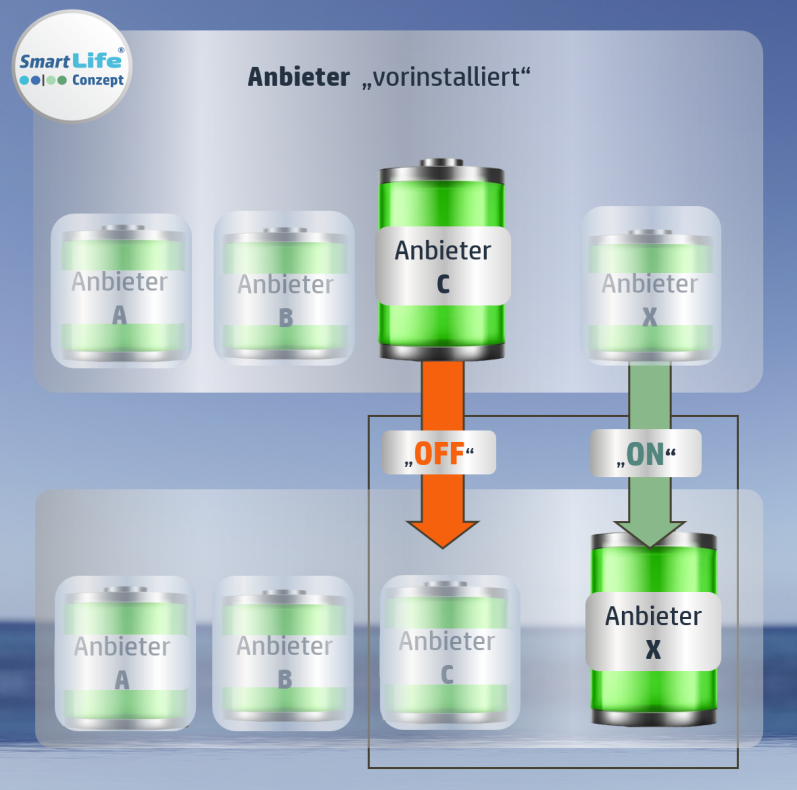 - mehrere Anbieter stehen unter einem Dach bereits "vorinstalliert" zur Auswahl